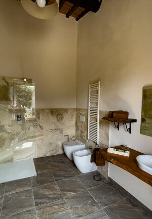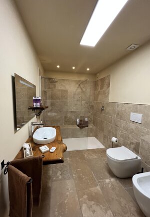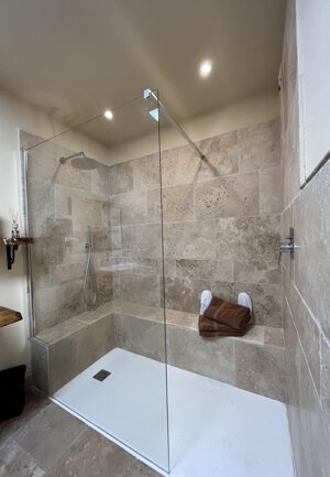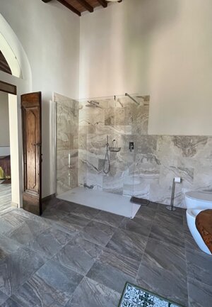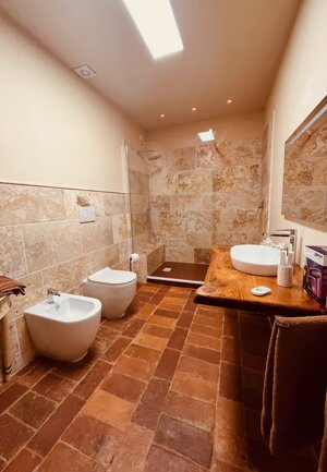 Nella sala da bagno, rivestita in travertino, avrete a disposizione un' ampia doccia di due metri quadrati.