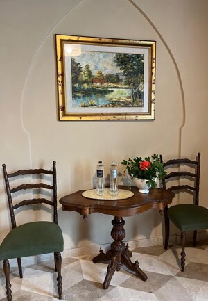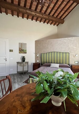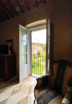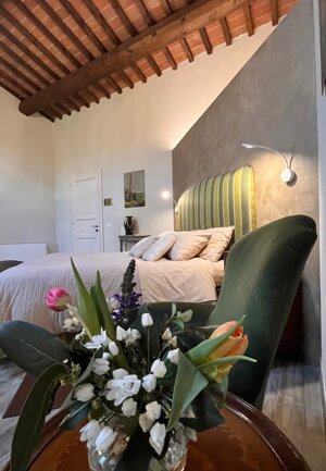 La camera ha il nome di mia sorella, donna dallo spirito classico, come classico toscano è l'arredamento di questa camera ampia con balcone.